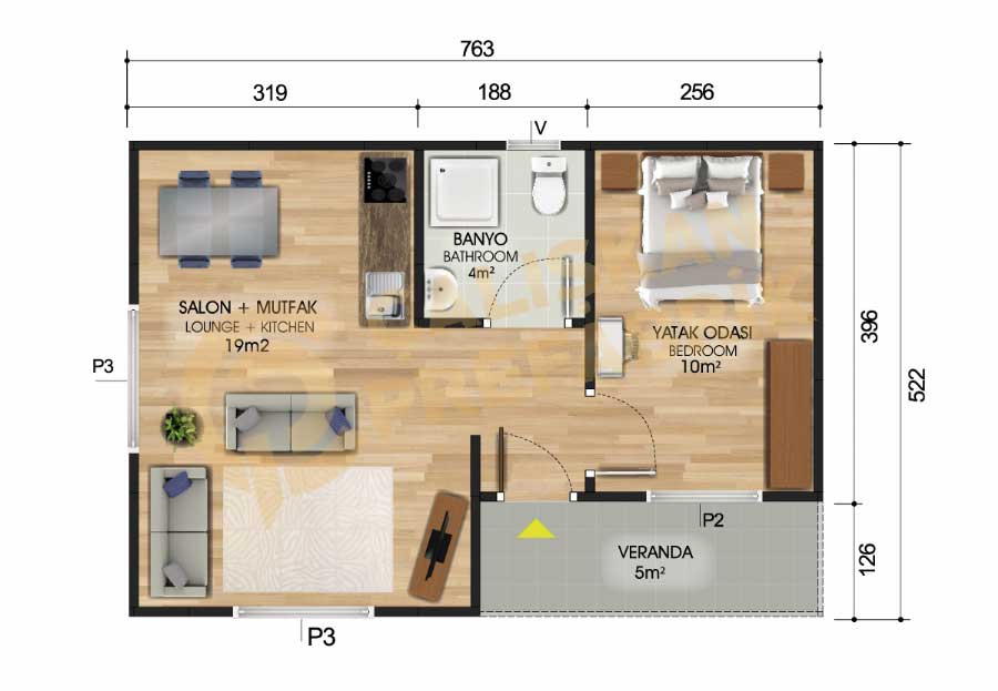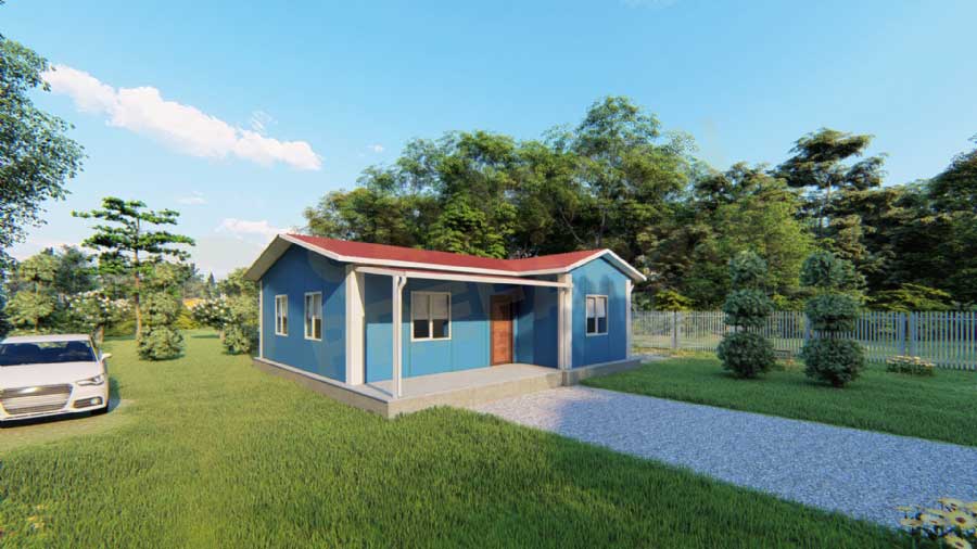Özellikle kentin biraz uzağında kalarak yaşamını sürdürmek isteyenler için ideal olan bu tek katlı prefabrik ev, güvenli ve rahat taşınabilirliği sayesinde istediğiniz konuma yerleştirilebilir.