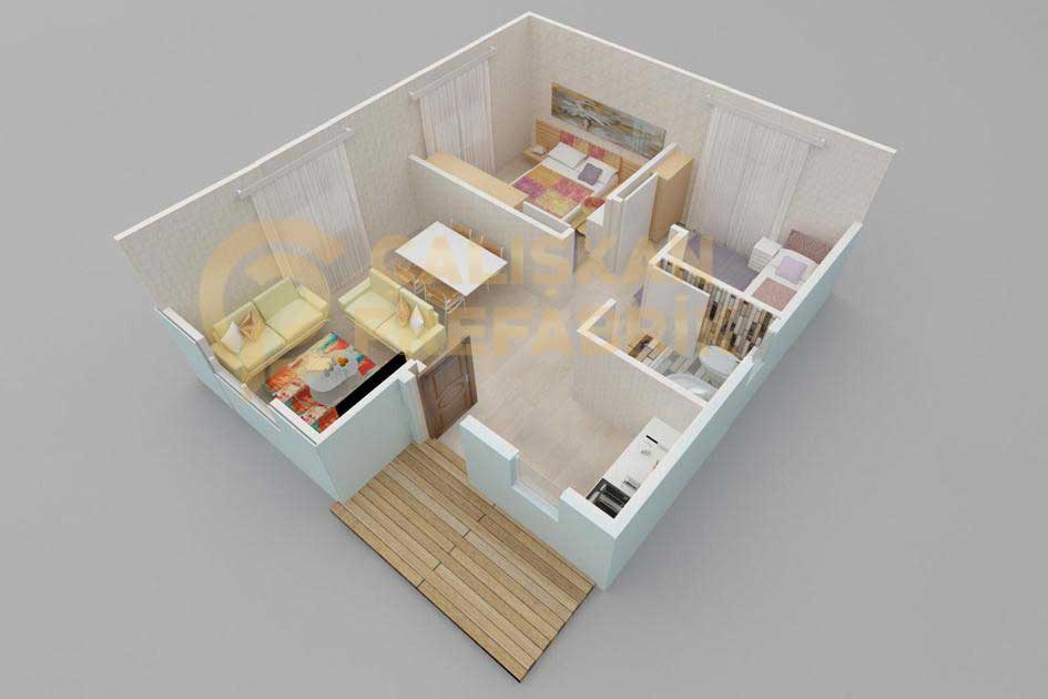 53 mt2 Prefabrik ev iç dizaynı istenilen projeye müşterinin isteklerine göre şekillendirilmektedir.