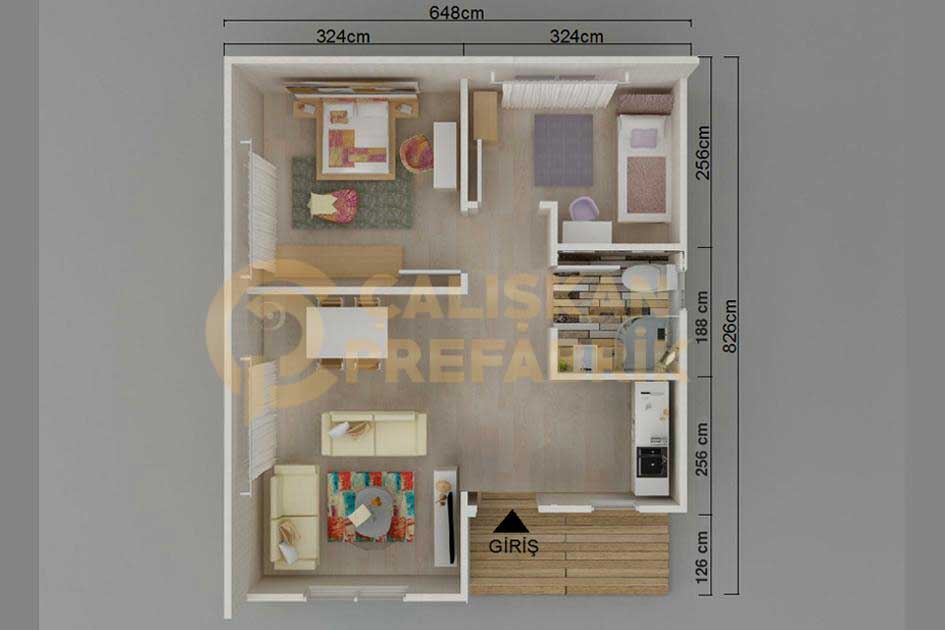 53 metrekare prefabrik ev özellikle yaşam anlayışına sahip olanlar için ideal evlerdir. Prefabrik ev, 250 cm tavan yüksekliğine sahiptir, pencereler PVC ile kaplıdır.