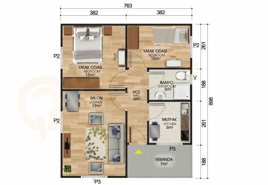 68 metrekare prefabrik ev özellikle yaşam anlayışına sahip olanlar için ideal evlerdir. Prefabrik ev, 250 cm tavan yüksekliğine sahiptir, pencereler PVC ile kaplıdır.